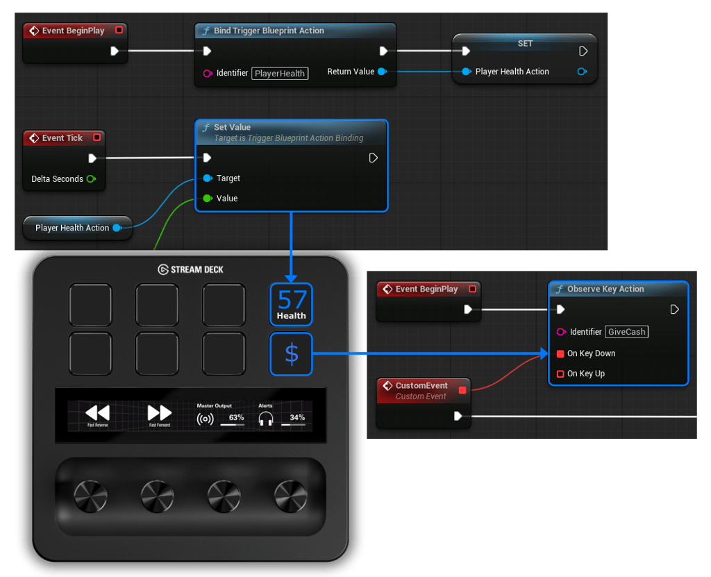 Trigger blueprints and send values back to Stream Deck for immediate feedback on the action display.